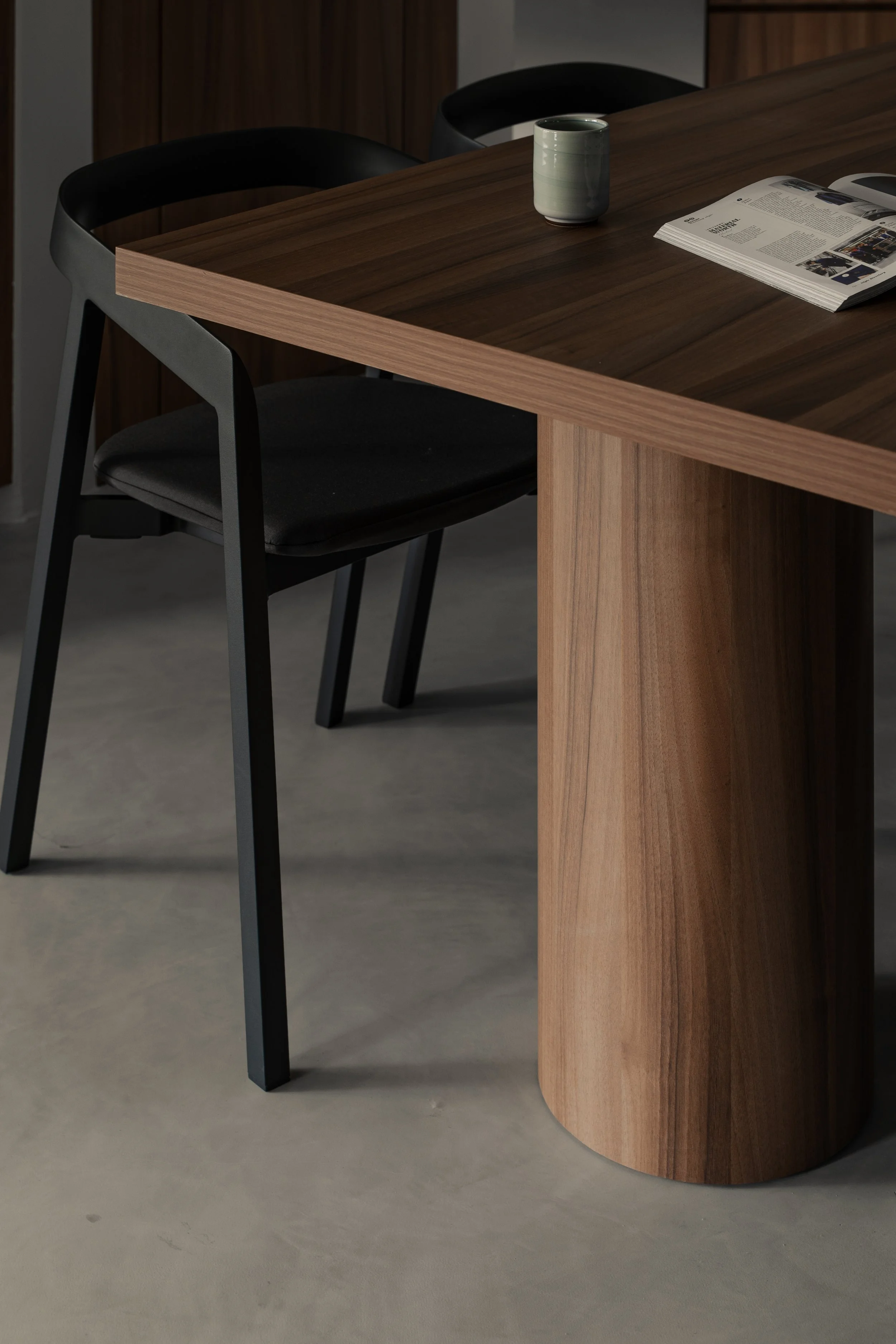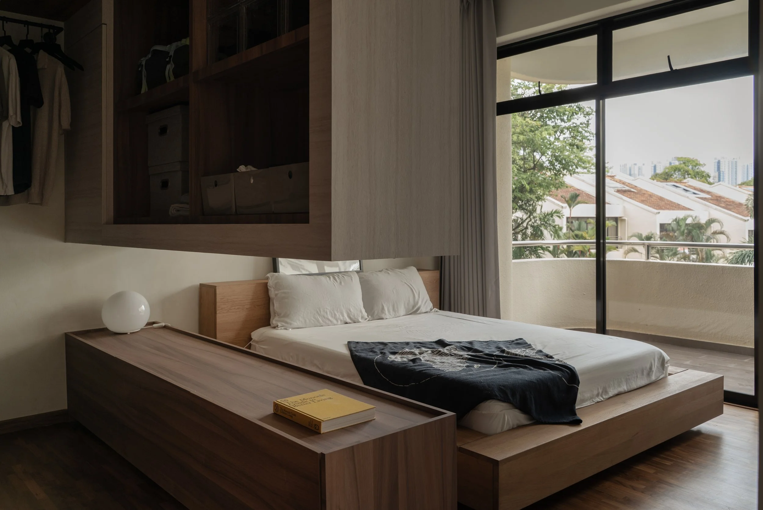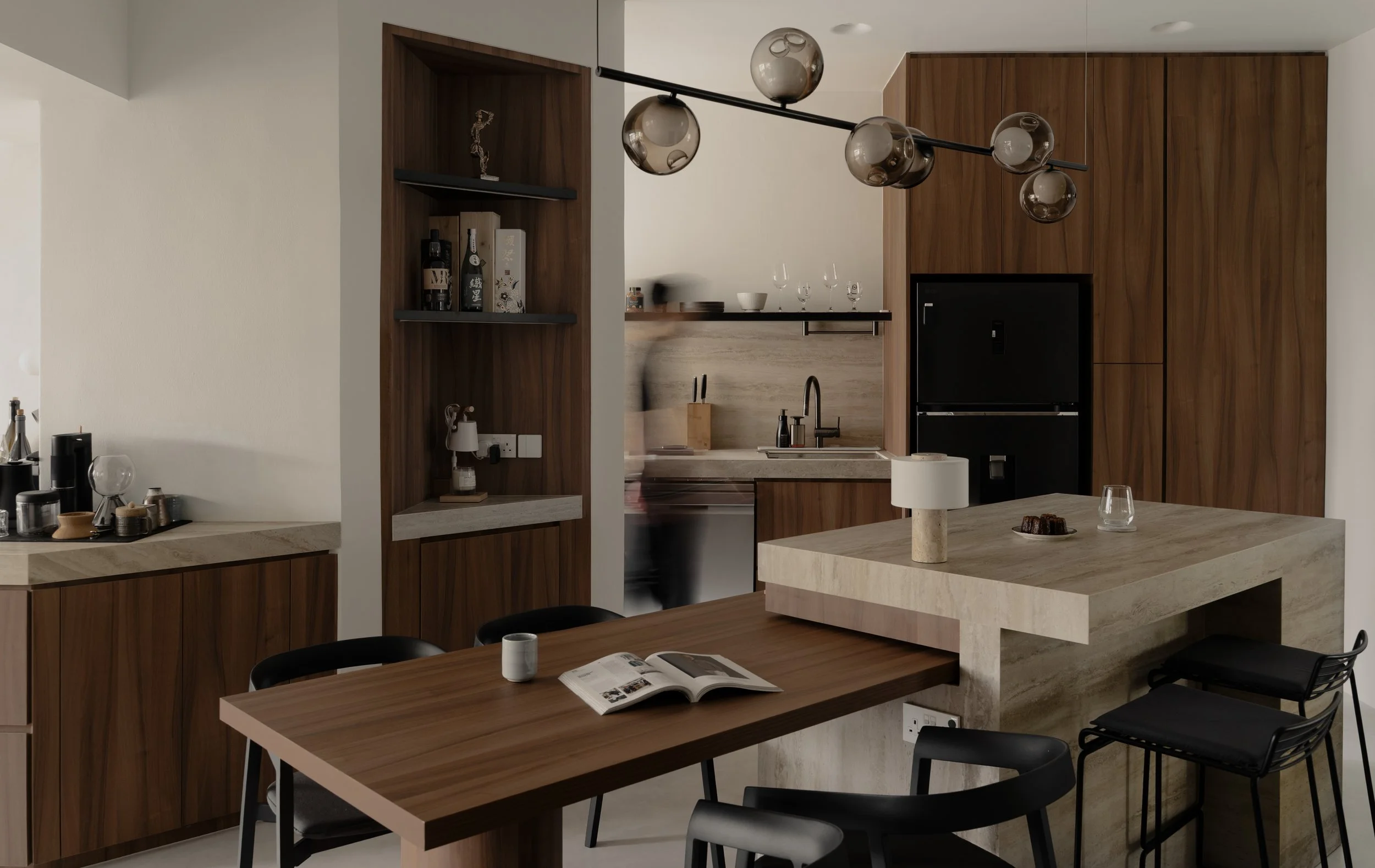 A home that focuses on seamless transitions, where the dining and kitchen overlap in boundaries to create refined flow. Designed by Unformn, this interior renovation blends wood, stone and neutral tones in a minimalist, modern style for contemporary living in Singapore.